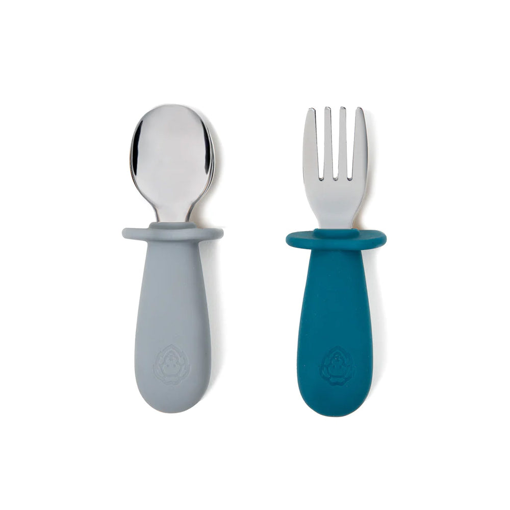 Machen Sie das Essen für Ihr Kind sicherer und stilvoller mit dem SOINA Besteckset in Midnight Blue und Pearl Grey – ideal für die ersten Schritte in den Umgang mit Besteck!