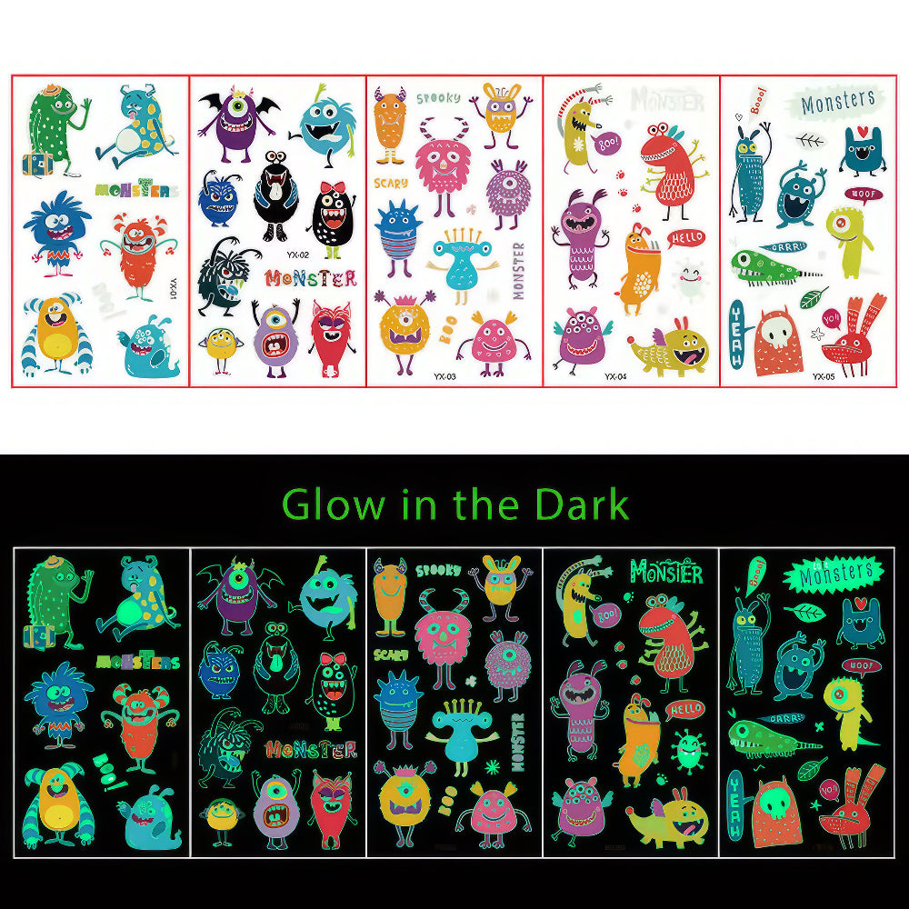 Bist du mutig genug für unsere lustige Monster-Parade? Am Tag begleiten dich freche, bunte Monster mit Kulleraugen und Grinsezähnen. Doch im Dunkeln wird es erst richtig spannend: Dann fangen ihre Augen, Zähne und Umrisse geheimnisvoll an zu leuchten! Perfekt für kleine Monster-Bändiger und jede Pyjamaparty. Hautfreundlich, kinderleicht aufzutragen und monstermässig cooler Spass. 5 Blatt mit mehr als 50 Tattoos