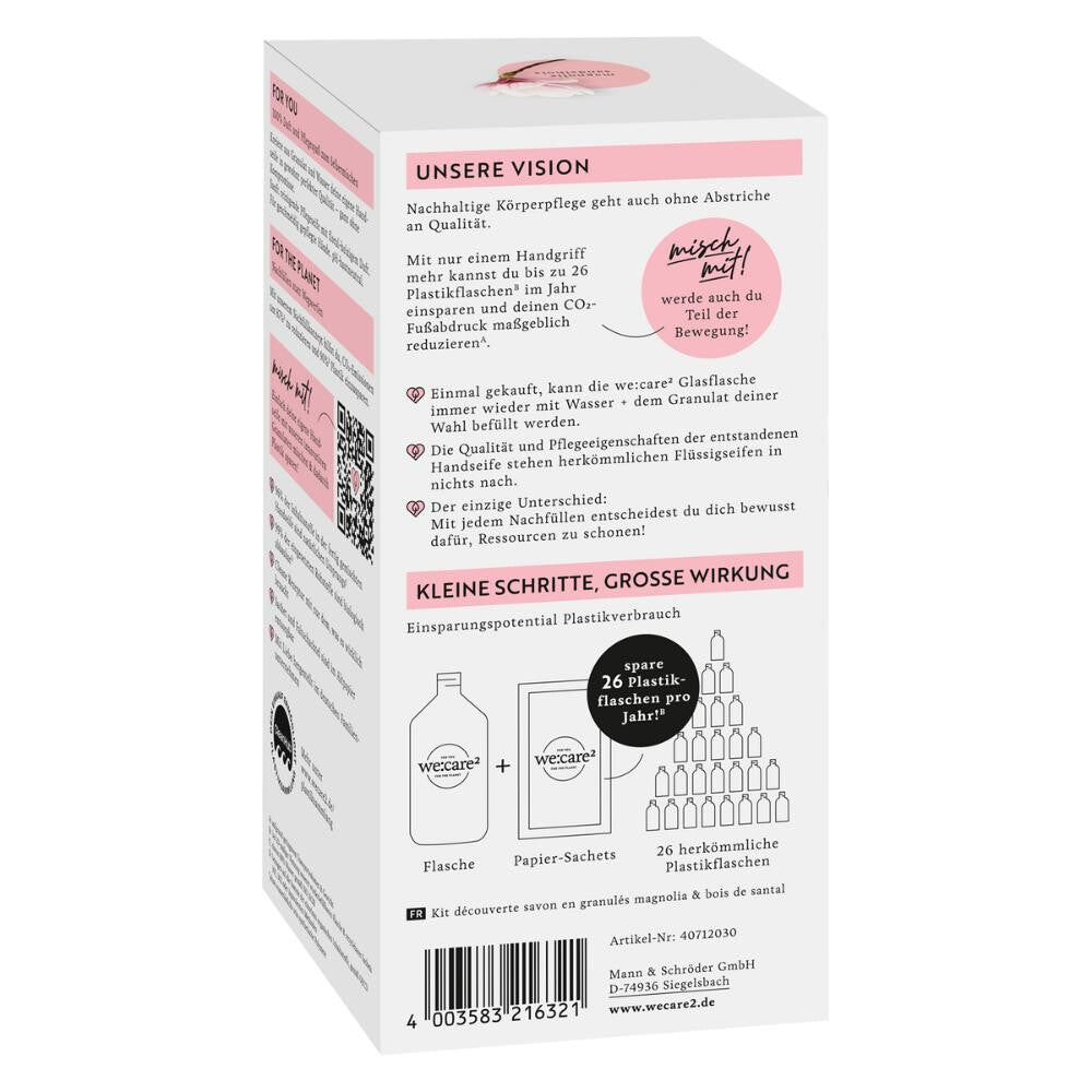 Mit dem we:care² Kennenlern-Set startest du in ein neues Pflegekapitel – nachhaltig, hautfreundlich und stilvoll. Mische deine eigene Handseife aus Seifenpulver und Wasser in der hochwertigen Glasflasche – ganz ohne Abstriche in Qualität oder Pflege.