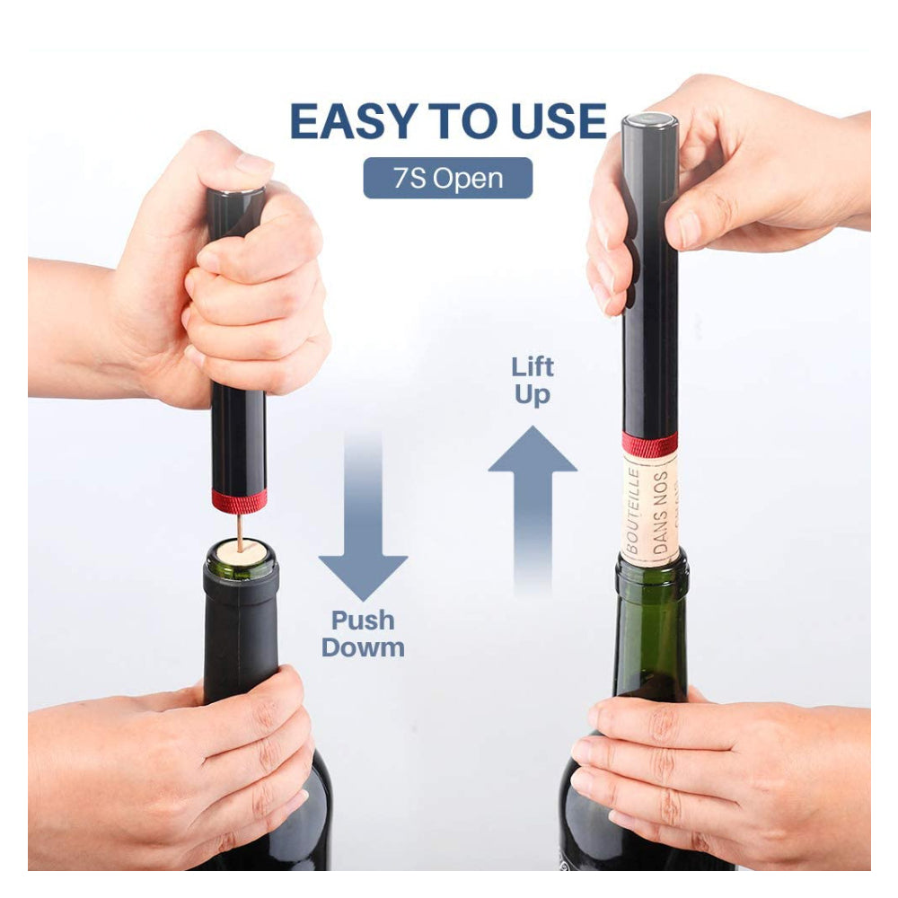 Hochwertiger Luft-Korkenzieher aus Kunststoff, Aluminium und Stahlspitze. So einfach geht's: Durch den Korken stecken und pumpen!