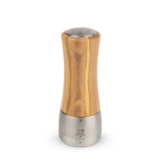 Die Peugeot Salzmühle Madras besticht durch eine elegante Kombination aus geöltem Olivenholz und Edelstahl und vereint Tradition mit modernster Technologie. Das besondere Highlight dieser Mühle ist die Innovation der letzten Generation: das Wegfallen der Mittelachse. Dieses unsichtbare, jedoch entscheidende System macht das Befüllen des Behälters deutlich einfacher. Der Mühlenbehälter ist durch einen praktischen Magnetverschluss zugänglich, der oben an der Mühle angebracht ist.