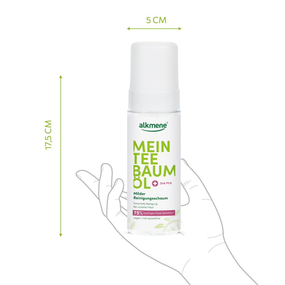 Gönnen Sie Ihrer Haut eine sanfte, porentiefe Reinigung und genießen Sie ein sichtbar verfeinertes Hautbild – Tag für Tag mit alkmene Mein Teebaumöl Milder Reinigungsschaum.