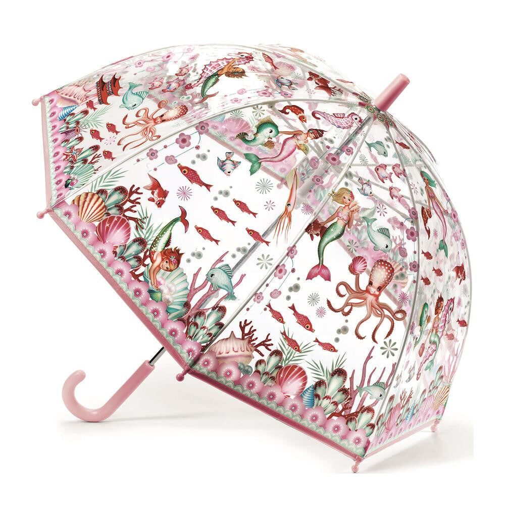 Djeco Regenschirm Meerjungfrau. Sehr schöner und hochwertiger - transparenter Regenschirm mit bunten Motiven - der absolute Hingucker! Das Öffnen und Schließen des Schirmes ist mit der Hand möglich (keine Automatik per Druckknopf). Grösse: Durchmesser 70 x 68 cm.