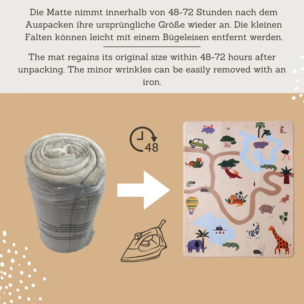 - Rutschfeste Rückseite: Diese sorgt für Sicherheit und schützt Ihr Kind vor Stürzen, indem sie den Teppich stabil an seinem Platz hält.