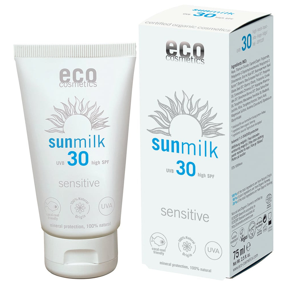Die Eco Cosmetics Sonnenmilch LSF 30 bietet zuverlässigen UVA- und UVB-Schutz durch rein mineralische Filter, die sofort nach dem Auftragen wirken. Dank der besonders leichten Textur lässt sich die Sonnenmilch mühelos verteilen und sorgt für ein angenehmes Hautgefühl – ideal für empfindliche Haut. Zusätzlich versorgt eine pflegende Mischung aus hochwertigen Pflanzenölen die Haut mit Feuchtigkeit und schützt sie vor vorzeitiger Hautalterung.