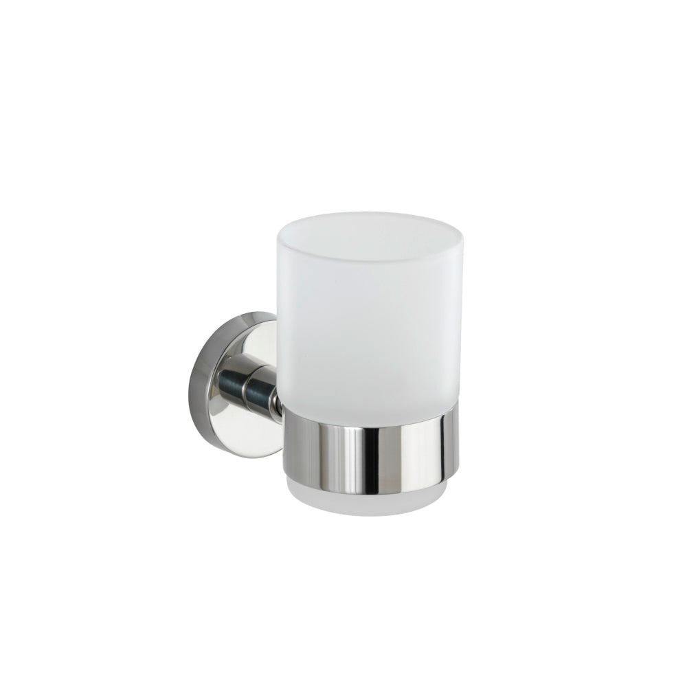 Hochwertiger, glänzender Edelstahl. Abnehmbarer Becher aus satiniertem Glas. Inkl. Schrauben und Dübel. 7 x 10.5 x 9.5 cm.